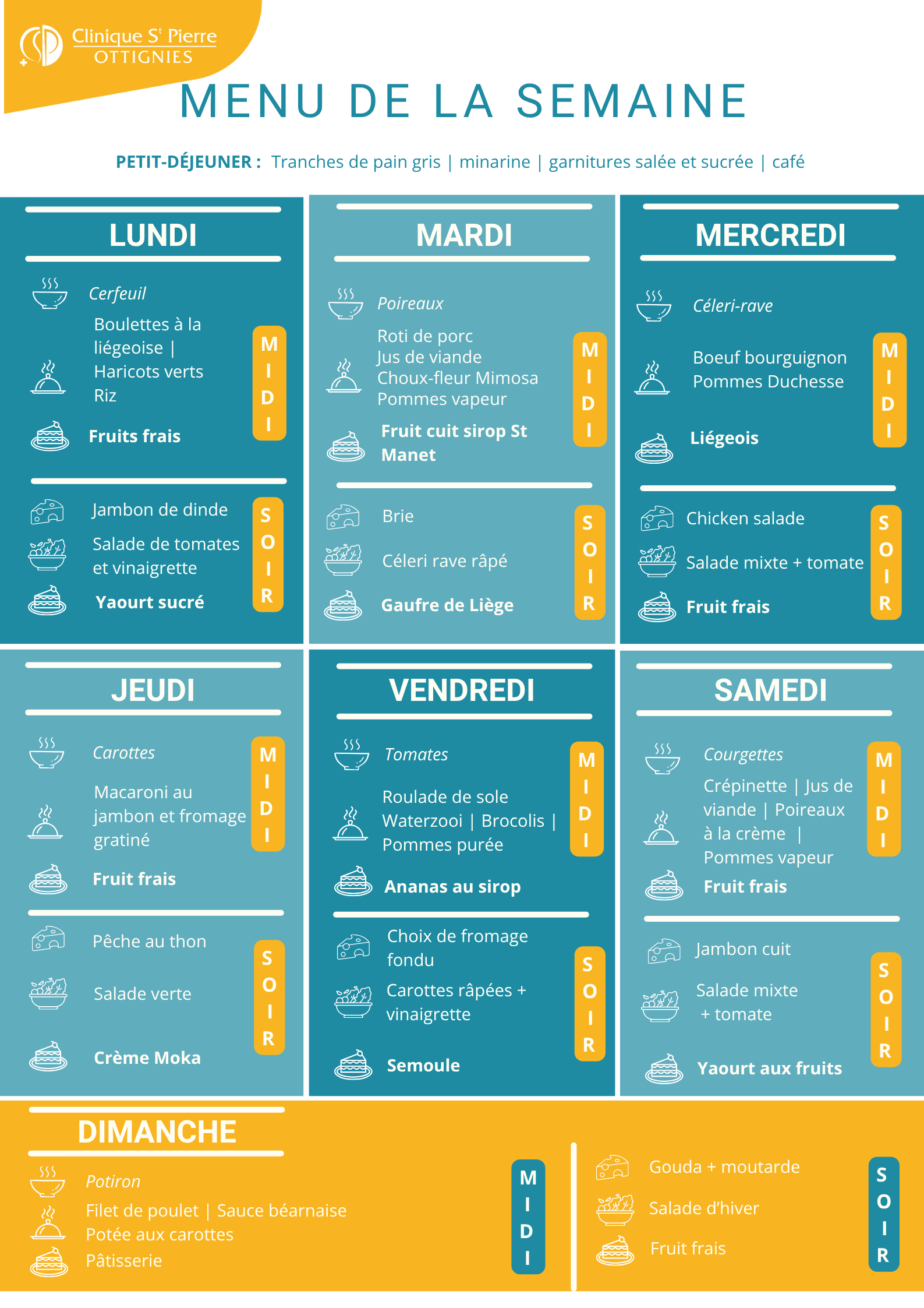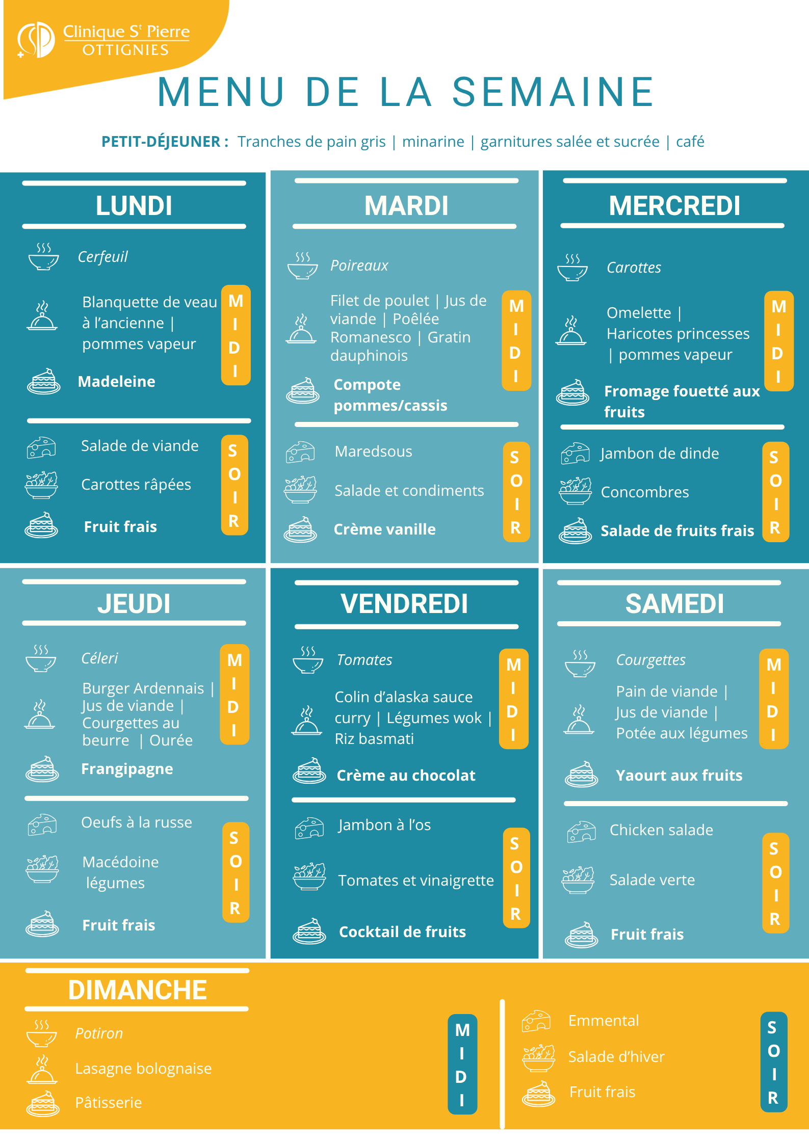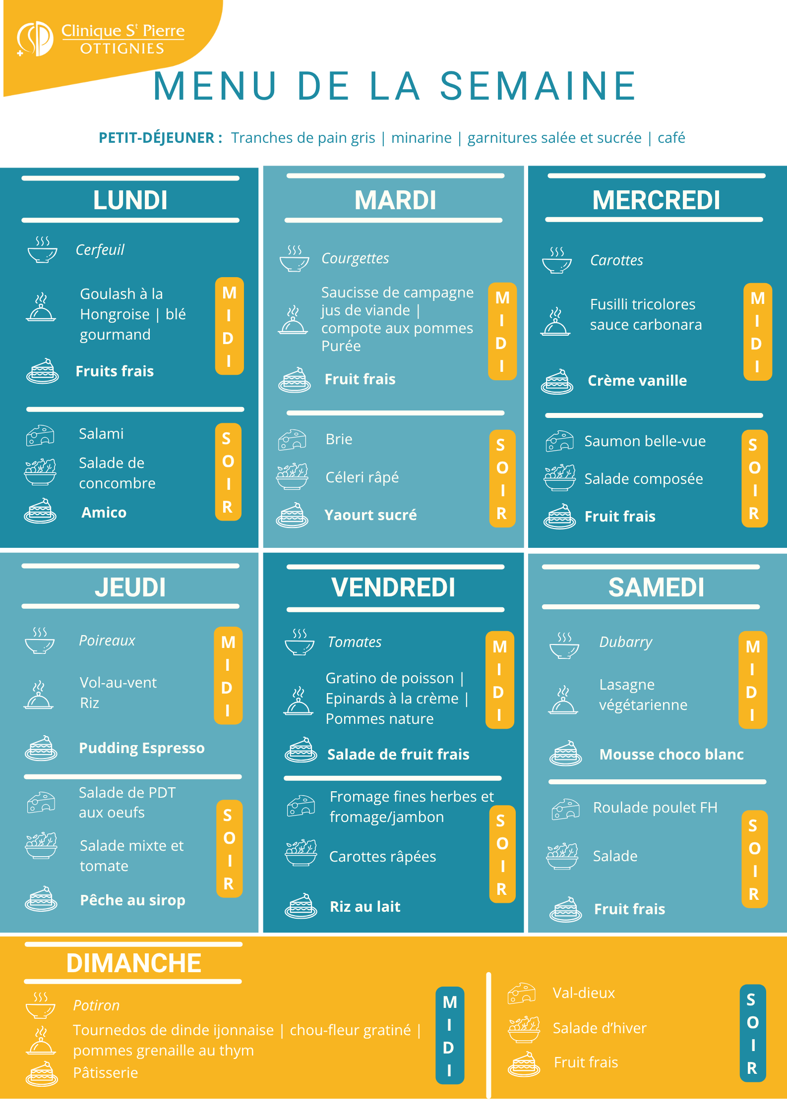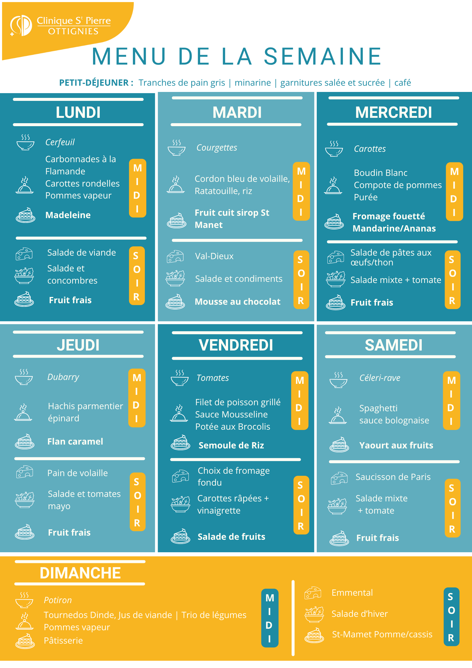 Découvrez sur cette page les prochains menus servis pour les patients hospitalisés :