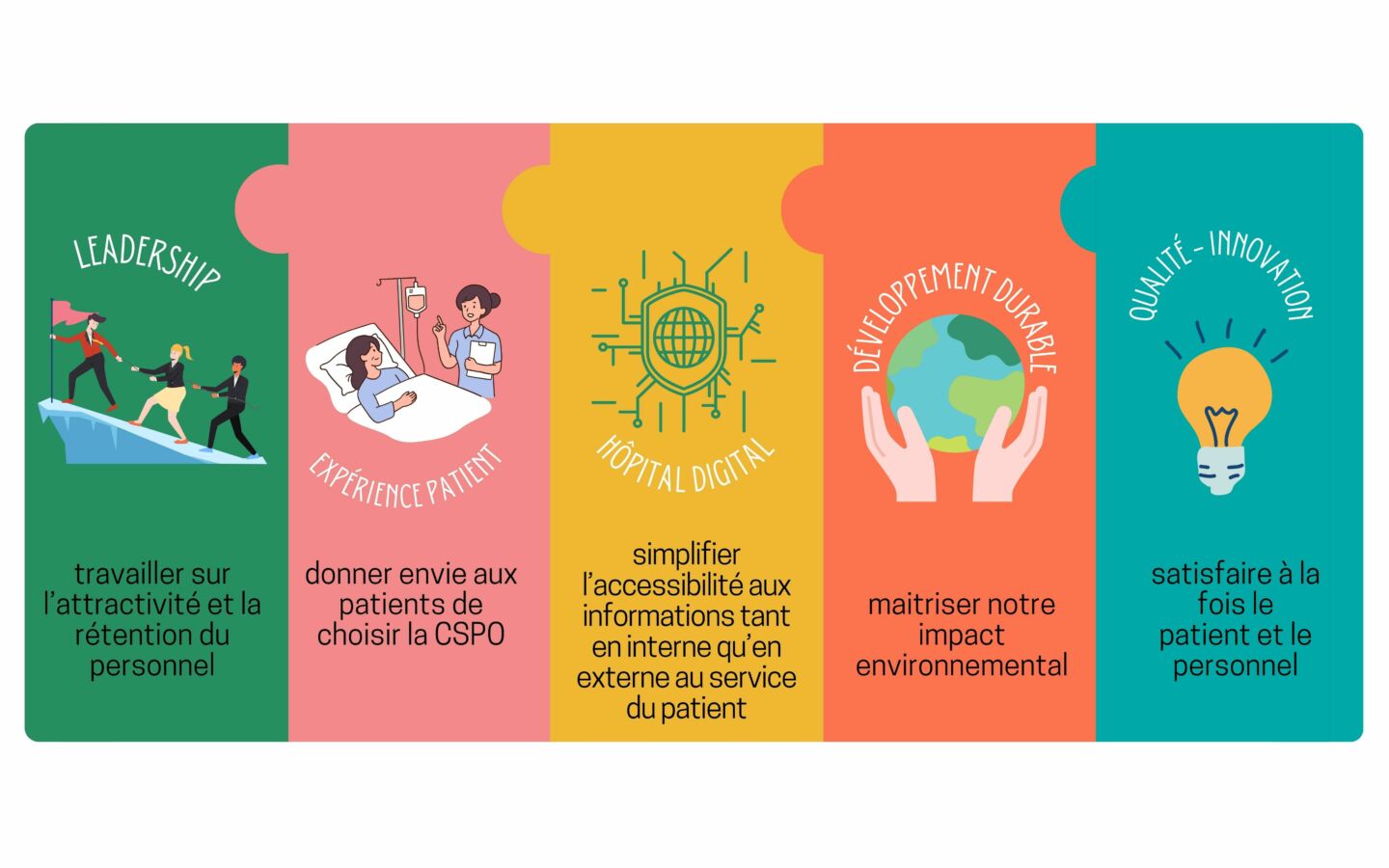 Au-delà des 5 axes stratégiques, 2 projets emblématiques transversaux sont en cours d’exécution au sein de la CSPO : le projet du nouvel hôpital et le déploiement du nouveau DPI (dossier patient informatisé). La méthodologie a veillé à ce que les plans d’actions soient alignés aux objectifs et planning de ces deux projets.